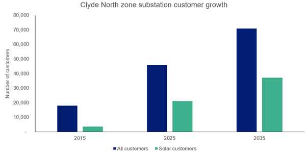 Our customer base has consistently grown in line with population growth, largely concentrated in the growth corridors in the south-east and north of Melbourne. With a large proportion of this population growth settling into new homes with rooftop PV, we expect higher solar penetration in these areas over the next ten years. For example, customers connecting to our growing Clyde North zone substation in Melbourne’s southeast, already have approximately 38% solar penetration, and this is forecast to reach around 52% by 2035.