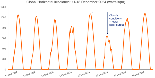 Many of this summer’s hottest days also had unusually significant cloud cover, reducing solar output from rooftop PVs. For example, while 16 December 2024 reached around 35 degrees, it was also very cloudy, reducing the day’s solar irradiance significantly when compared to average peaks and having a consequential impact on the amount of rooftop PV generated per kW of capacity. See below for details.