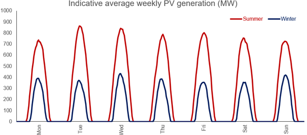 In our electricity distribution network, peak demand for electricity usually occurs in the early evening as people return home from work and school and begin cooking, heating and cooling their homes. While output from rooftop PV is typically lower at these peak times, the strong uptake of rooftop PV means that it still plays an important role in reducing demand from the grid. This is particularly true in summer, where the sun remains higher during peak demand periods. As shown below, megawatt (MW) output across our network from our rooftop PV customers is significantly higher in summer than winter.