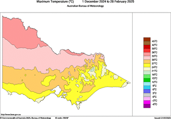 The summer of 2024-25 was an unusually hot summer for Victoria. According to the Bureau of Meteorology, it was the fourth warmest summer on record since 1910, with average maximum temperatures 2 °C above the 1961–1990 average.