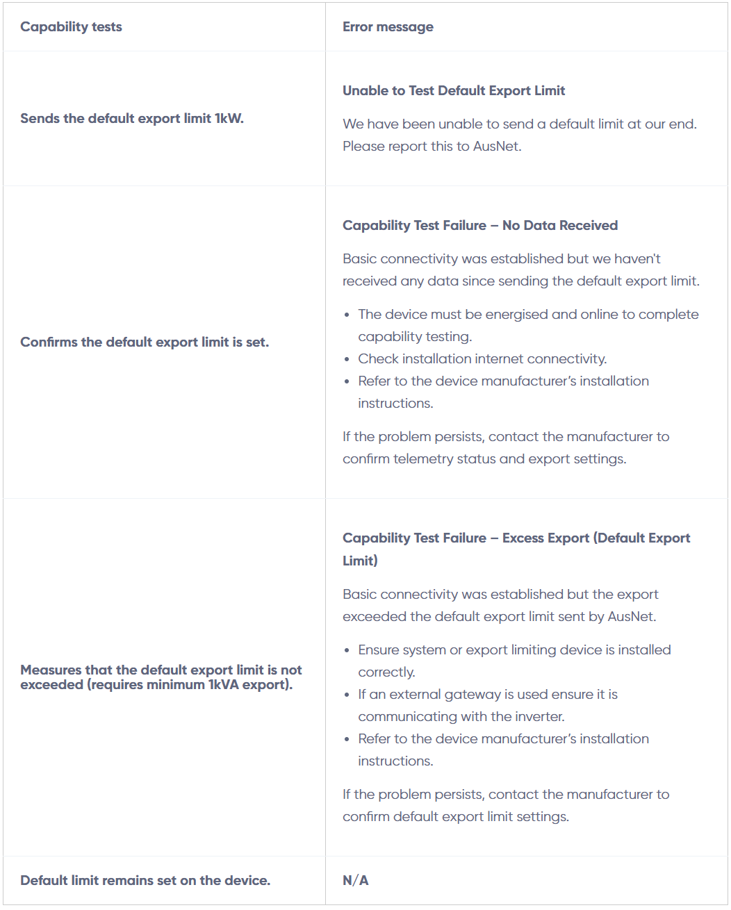 - The customer’s device will move from the default 1kW export to the allowable export limit once the post-installation form is submitted. Check the correct export limit is submitted as this is the limit sent to the customer’s device.